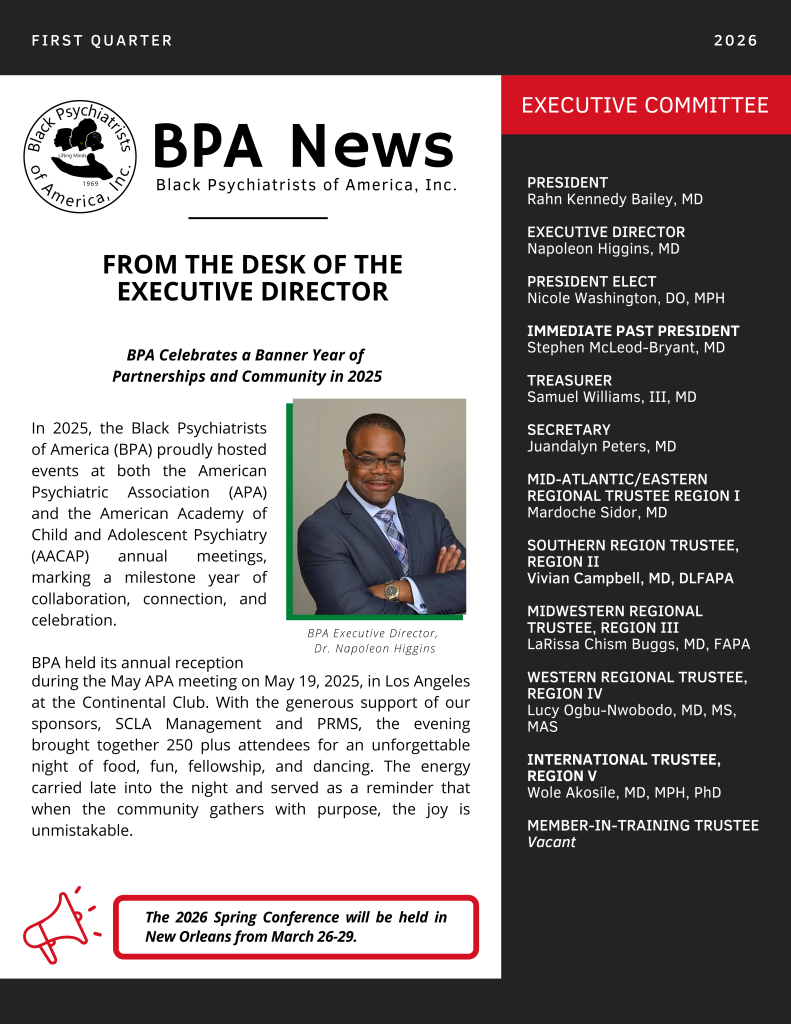To download the newsletter PDF, click here. Executive Director’s Address In 2025, the Black Psychiatrists of America (BPA) proudly hosted events at both the American Psychiatric Association (APA) and the American Academy of Child and Adolescent Psychiatry (AACAP) annual meetings, marking a milestone year of collaboration, connection, and celebration…. read more BPA’s 2025 Transcultural Conference: […]