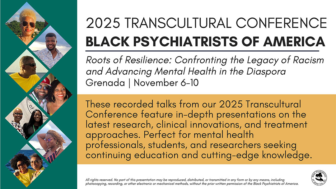 BPA is pleased to be able to offer our members an archive of valuable educational content, including recordings from past conference sessions—all available for replay at your convenience. Each video is professionally hosted on Vimeo and can be rented for one week at the low cost of $3 per video. Catch up on sessions you missed or revisit key insights anytime—your purchase supports our efforts to provide continuing education for psychiatrists serving people of African descent.